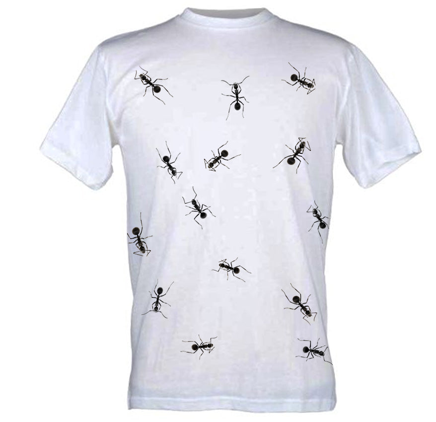 Screen printed "Ant Invasion" design from the Creative Nature collection, based on original photography by James Campbell. 100% Cotton - designed, printed, made in South Africa. Double sided print - ants on the front and back of each shirt.
